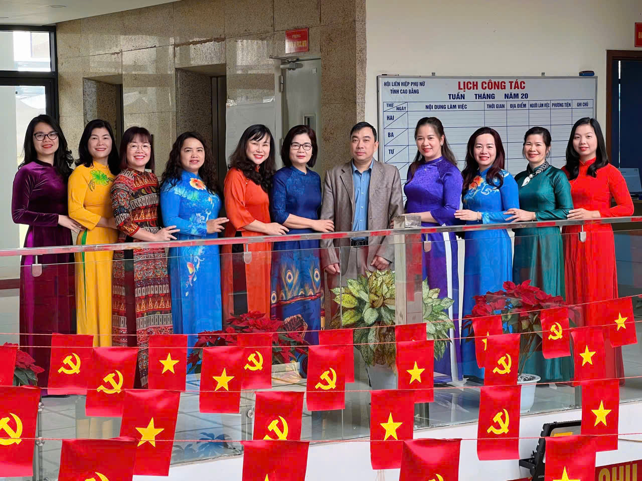 Bên cạnh đó, nhiều cơ quan, đơn vị và địa phương cũng tổ chức chụp ảnh tập thể trong trang phục áo dài tại trụ sở làm việc, khuôn viên cơ quan hoặc các địa điểm đẹp trên địa bàn, tạo nên những hình ảnh rực rỡ sắc màu, góp phần lan tỏa vẻ đẹp của tà áo dài và tinh thần tự hào của phụ nữ Cao Bằng.